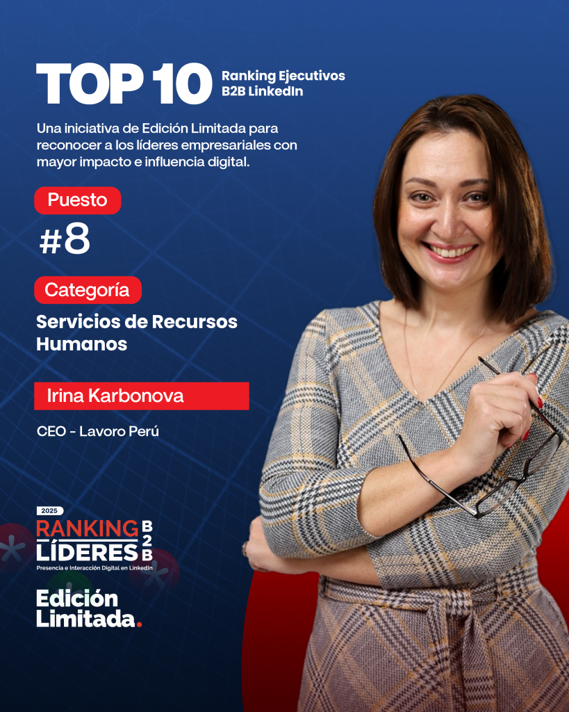 En Lavoro Perú celebramos con orgullo un hito que resalta nuestro liderazgo en el sector de gestión humana y posicionamiento digital. Nuestra CEO, Irina Karbonova, ha sido reconocida en el Top 10 del Ranking de Líderes B2B – Servicios de Recursos Humanos 2025, una distinción que evalúa la Presencia e Interacción Digital en LinkedIn y que es organizada por Edición Limitada – Marketing de Contenidos, agencia especializada en estrategias digitales para empresas B2B.
